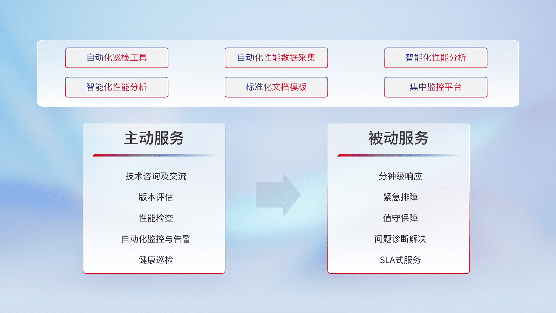智能化工具和标准化文档,,,保障服务质量,,提供主动服务(包含技术咨询、、、版本评估、、、性能检查、、、自动化监控与告警、、、、健康巡检)和被动服务包含(分钟级响应、、、、紧急排障、、、值守保障、、问题诊断解决、、、、SLA服务)。。。
